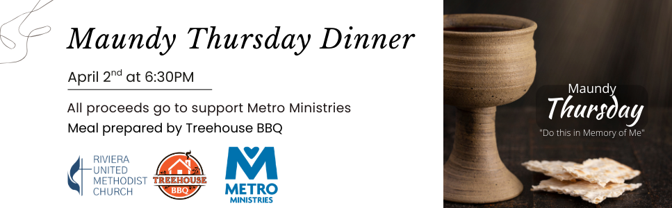 Maundy Thursday Dinner. Join us for Dinner Church as we remember the Last Supper and share in Holy Communion, reflecting on Jesus’ commandment to love one another. Reservations are needed so we can prepare accordingly. Our meal will be prepared by Treehouse BBQ. A suggested donation of $20 per adult is appreciated. Kids eat free, with nuggets and mac & cheese available just for them. All proceeds will go to support Metro Ministries. We hope you’ll join us for this meaningful evening of fellowship and worship.